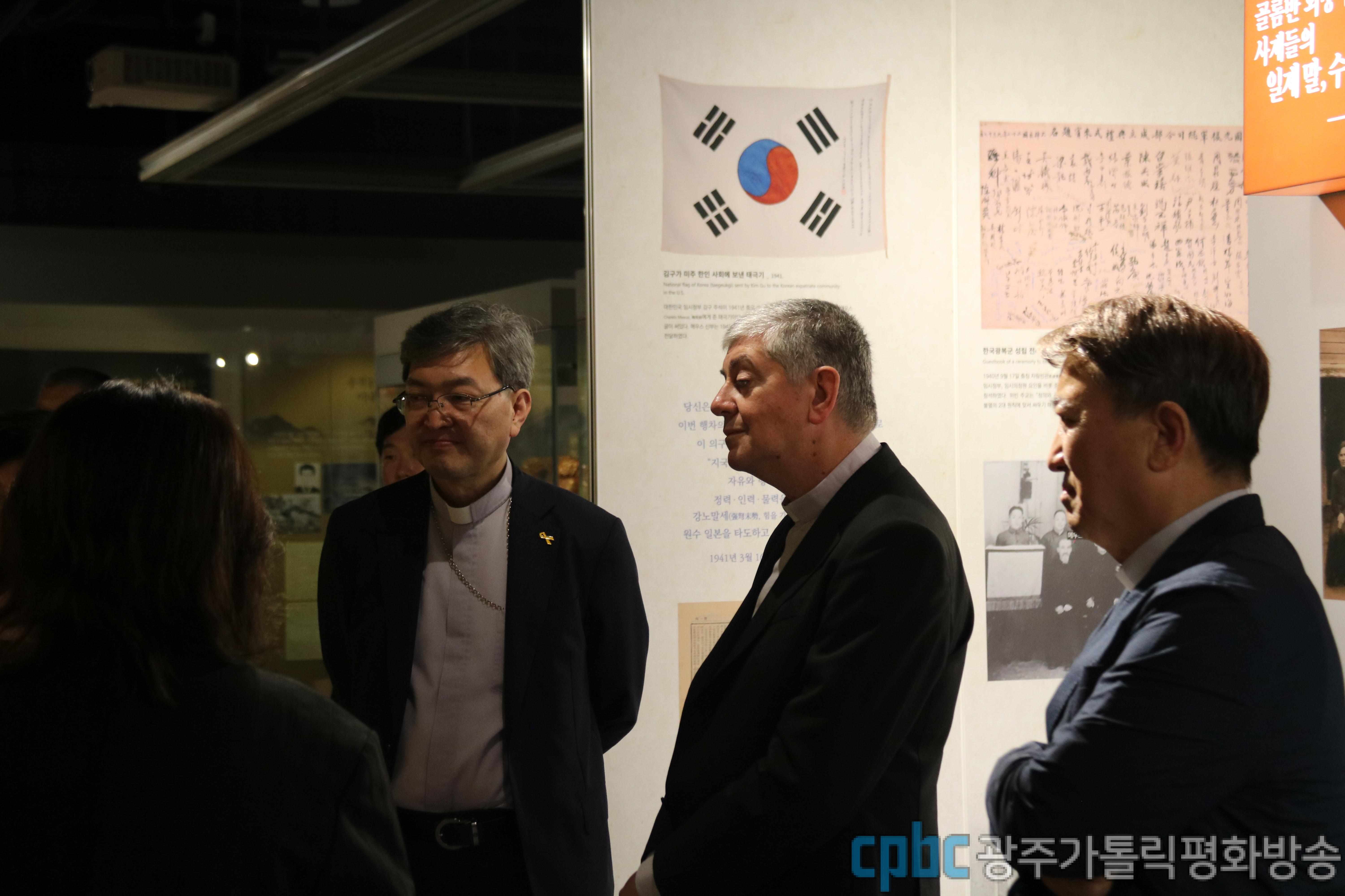 참배를 마친 뒤 광주가톨릭박물관으로 자리를 옮긴 조반니 가스파리 대주교는 광복 80주년을 맞아 마련된 안중근 토마스 의사와 가족들의 삶, 신앙 그리고 교구의 역사와 신앙의 발자취가 담긴 전시관을 둘러봤습니다.