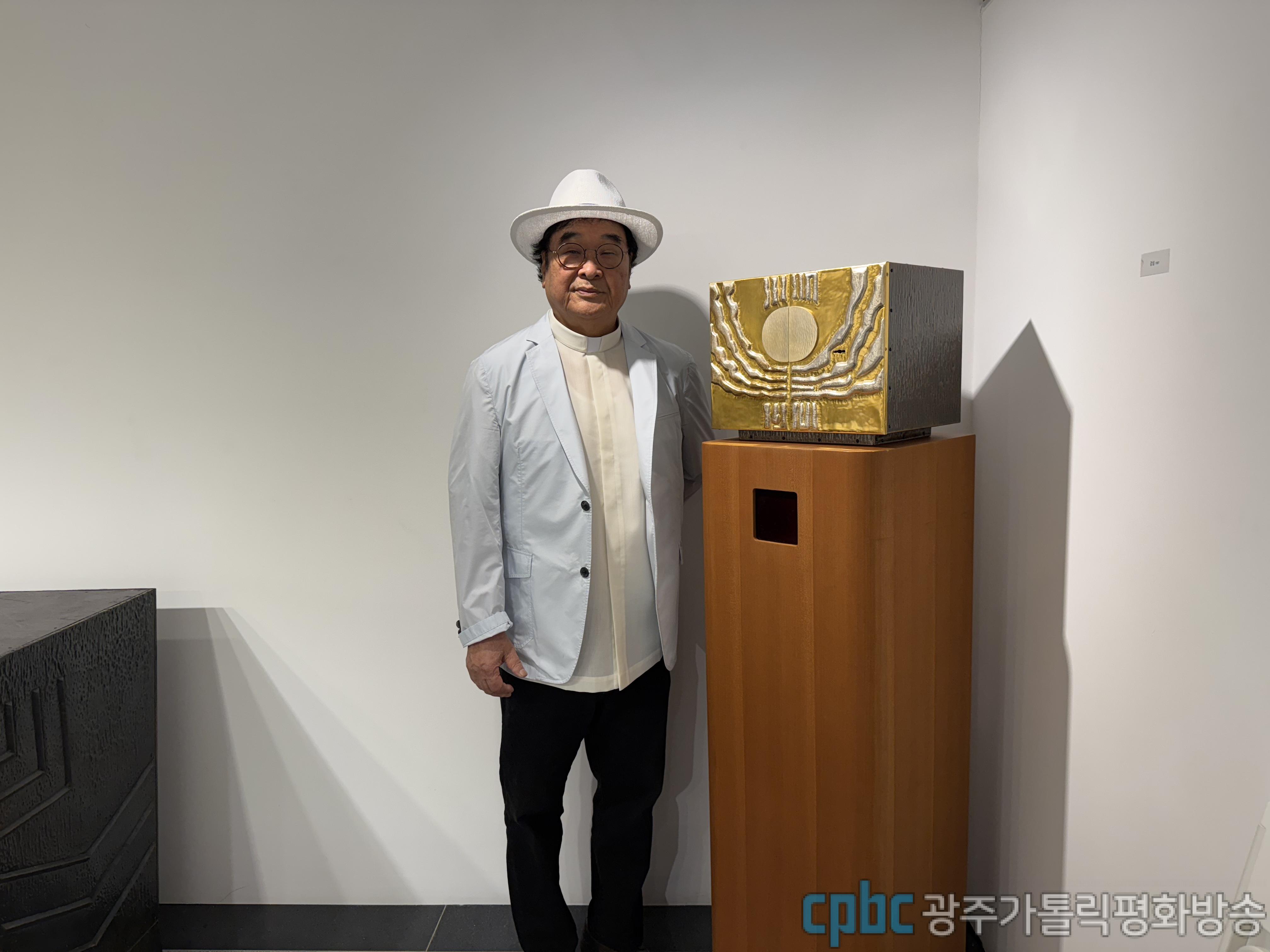 진행자: 저는 지금 광주대교구청 ‘갤러리 현’에 나와 있습니다. 이곳에서는 광주대교구 원로 사목자이신 송현섭 베드로 신부님의 사제 수품 50주년을 기념하는 ‘금경축 미술전시회’가 열리고 있는데요. 먼저 전시를 준비하신 송현섭 신부님을 직접 만나 말씀 나눠보겠습니다. 신부님 안녕하세요~