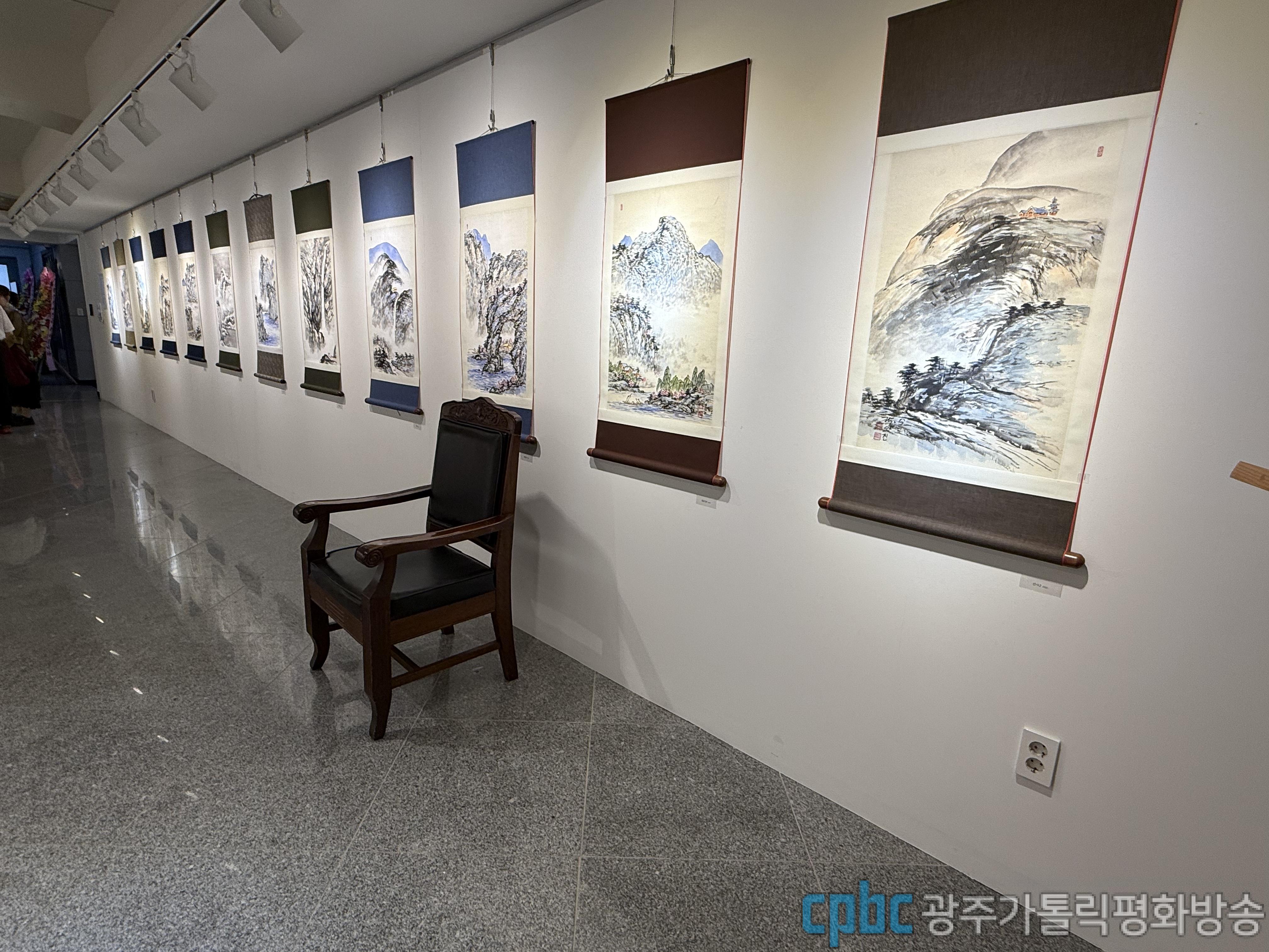 쌍촌동본당 김순희(엘리사벳): 예 산사라는 작품이 너무 감동이 왔고요. 그리고 또 이제 큰 대작이 있는데 그 작품을 보니까 제목을 내가 자세히 못 봤는데 너무 산세가 깊은 거예요. 산세가 너무 깊어 가지고 그 무릉도원. 그게 막 연상이 되고 너무 좋았습니다.