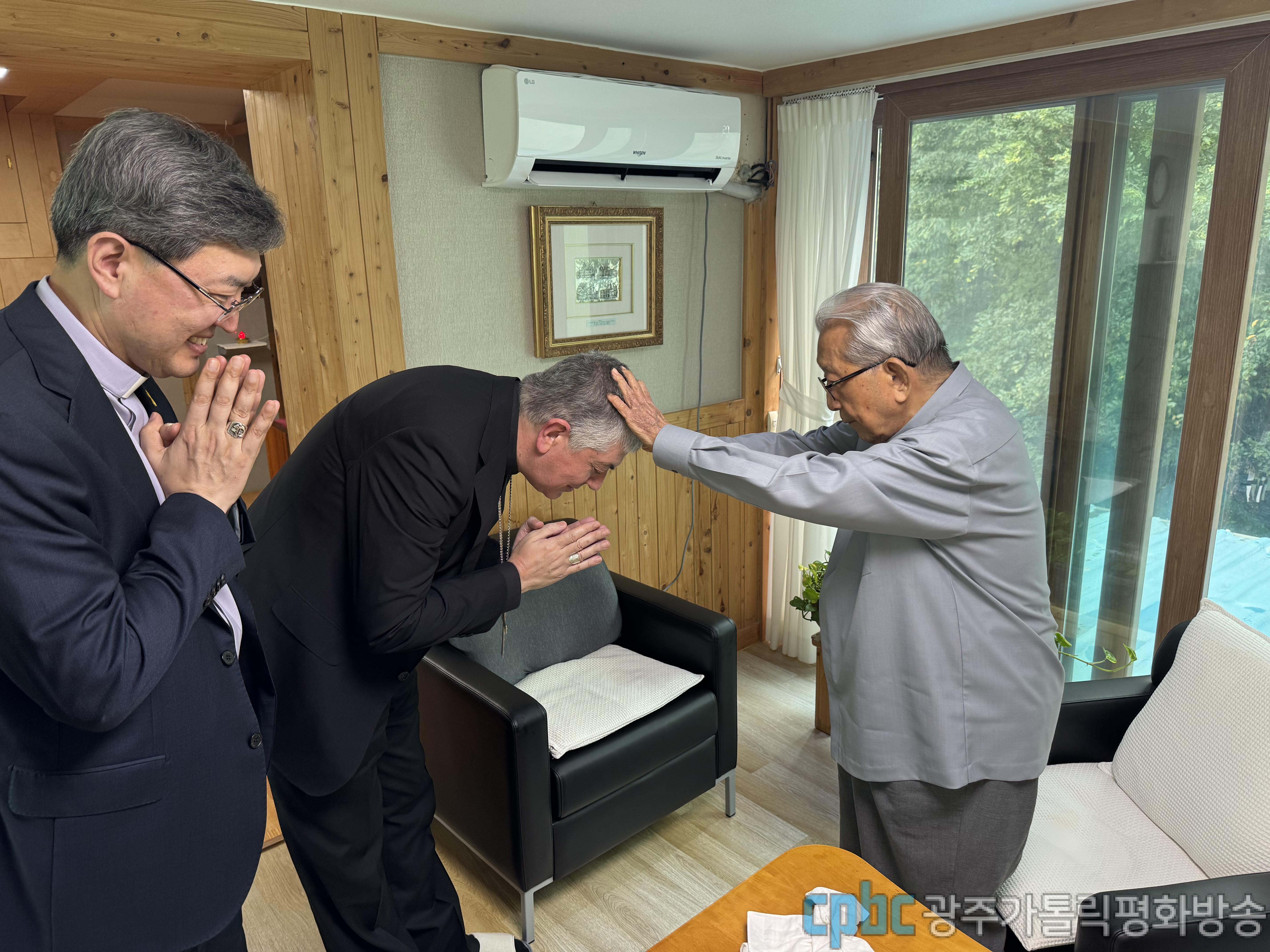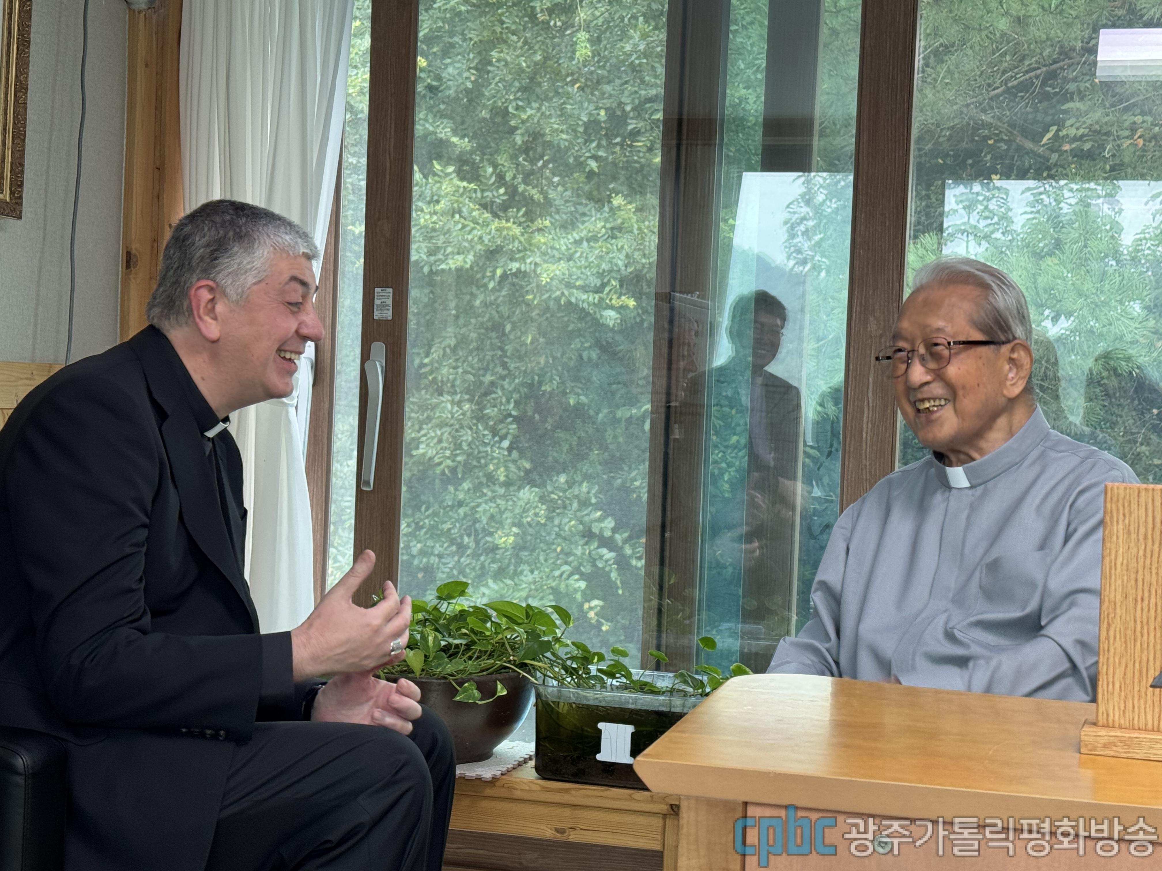 앞서, 조반니 가스파리 대주교는 이날 오후 2시 나주시 남평읍에 있는 광주가톨릭대학교 주교관에서 윤공희 대주교를 만나 손을 꼭 잡은 채 안부를 물었습니다.